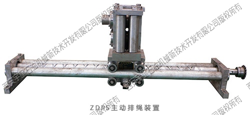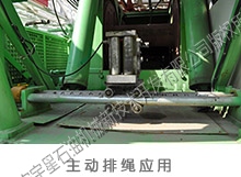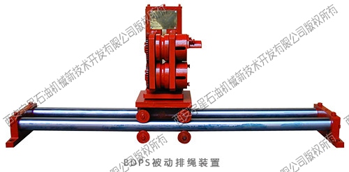 排繩機(jī)構(gòu)主要由鏈條、導(dǎo)繩板、主動(dòng)排繩絲杠、傳動(dòng)箱、傳動(dòng)軸、取力鏈輪及其附件所組成。安裝固定后取力鏈輪與通井機(jī)(或修井機(jī))主滾筒軸軸頭相連,當(dāng)滾筒旋轉(zhuǎn)時(shí)帶動(dòng)取力鏈輪旋轉(zhuǎn),再通過鏈條及被動(dòng)鏈輪帶動(dòng)傳動(dòng)箱、傳動(dòng)軸、和絲杠旋轉(zhuǎn),嵌在絲杠螺旋槽內(nèi)滑塊隨著絲杠的旋轉(zhuǎn)而左右移動(dòng),導(dǎo)繩架隨著滑塊而左右移動(dòng),滾筒每旋轉(zhuǎn)一圈,導(dǎo)繩架向左或向右移動(dòng)一個(gè)鋼絲繩直徑。排繩裝置還可與指深傳感裝置配合安裝,能較為精確地測量滾筒鋼絲繩收放的長度。